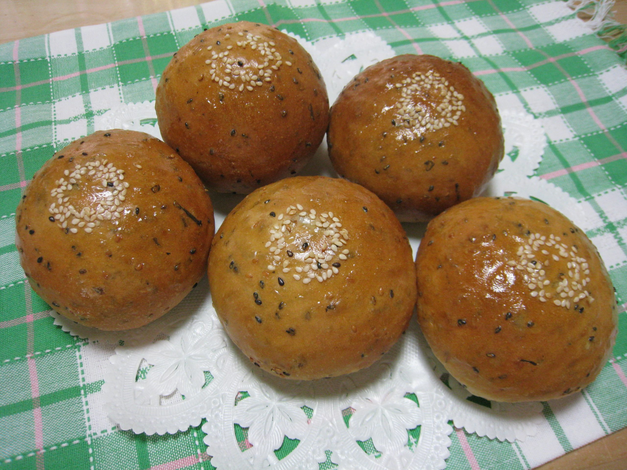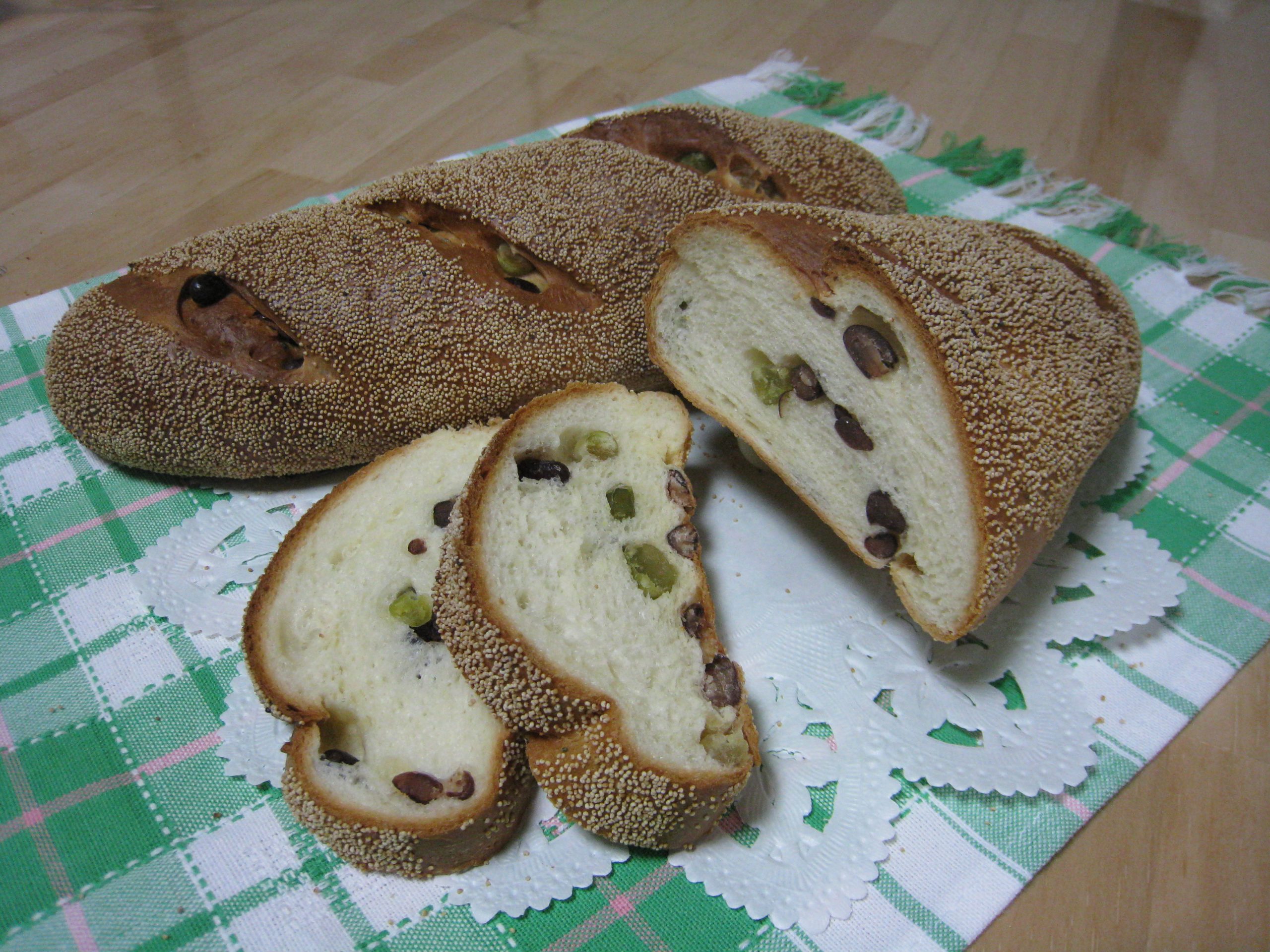 大納言とうぐいす豆を入れて回りにたっぷりケシの実をつけてパリッと焼いた